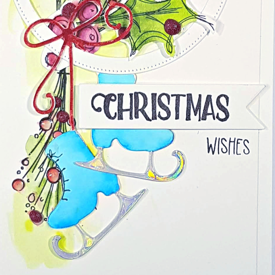 After layering up my stamped images, I placed the frame over the background but threaded the Ice Skates die cut through before sticking down. This way they dangle just why I wanted them to be. The skates have been both paper pieced & water coloured.