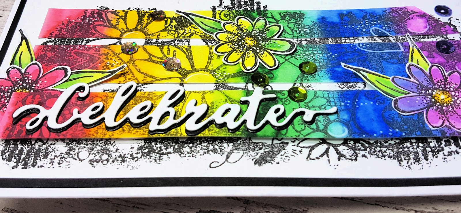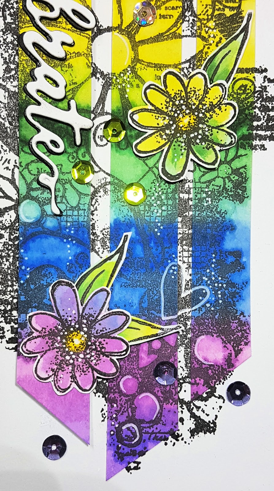Below are a selection of close up photos show casing different aspects of my finished card. You may notice that after I completed my card on the video, I have added a few "extras"; sequins and highlights using a white pen.